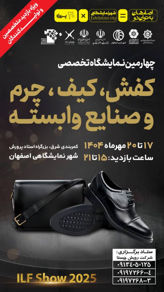اصفهان میزبان چهارمین نمایشگاه تخصصی صنعت کفش و کیف با حضور بیش از ۴۰ مشارکتکننده به گزارش پایگاه خبری طبیعت گردشگران ،مدیرعامل شرکت نمایشگاه استان اصفهان گفت: چهارمین نمایشگاه تخصصی صنعت کفش، کیف، چرم و صنایع وابسته از تاریخ ۱۷ تا ۲۰ مهرماه سال جاری در شهر اصفهان برگزار میشود. احمدرضا طحانیان اظهار داشت: این رویداد مهم صنعتی، فرصتی مغتنم ...