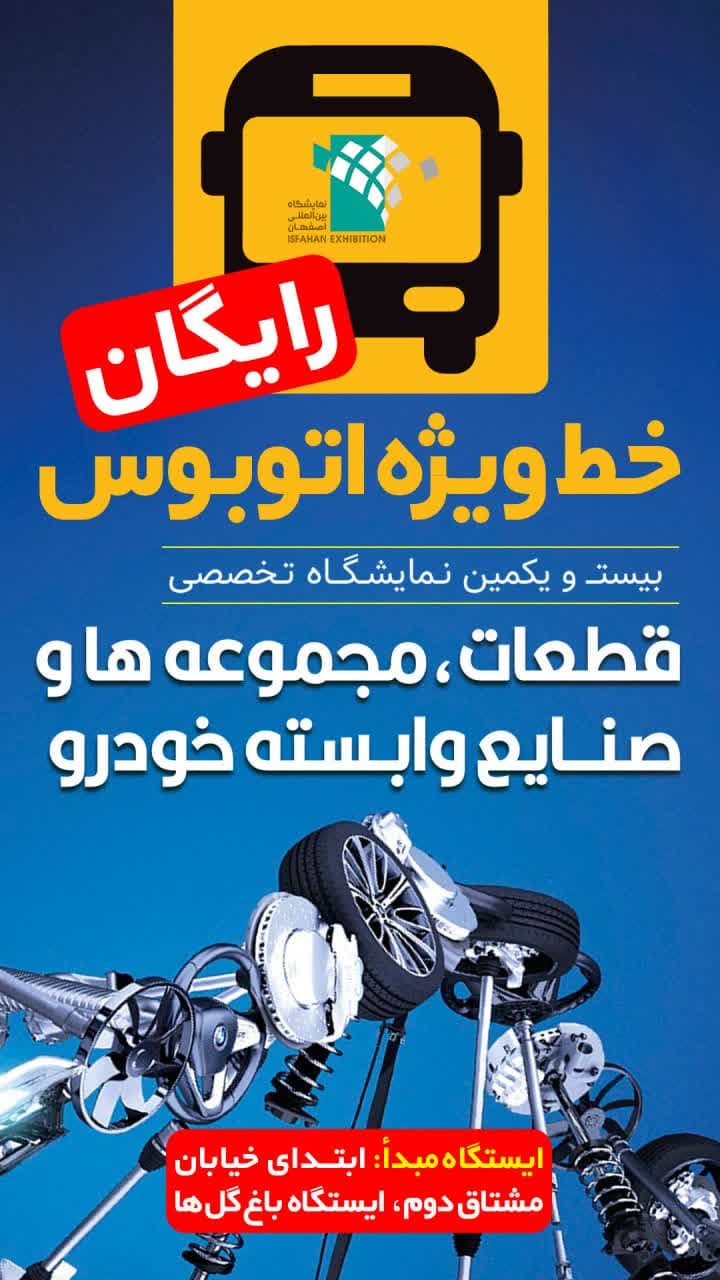 جهت خدمت به مردم شریف روزانه از ساعت 15:30 تا 22:30 از محل پل بزرگمهر، ابتدای خیابان مشتاق دوم، ایستگاه باغ گل ها چندین دستگاه اتوبوس به مقصد نمایشگاه اصفهان با فاصله تردد هر یک ساعت، اختصاص یافته است. ✅از فردا👇👇👇 نمایشگاه تخصصی قطعات و صنایع وابسته به خودرو 🗓27 تا 30 مردادماه 1404 ⏰ساعت بازدید: 16 تا 22 ...